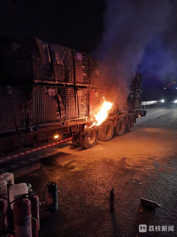 当晚21时09分许,大队应急值班人员接苏州管理处监控分中心通知,G2 K1133+000(上海方向)发生货车起火事故。接报后,交通执法人员立即赶赴现场。21:30分许,到达现场后,发现一辆苏B牌照半挂货车车箱底部冒着火,火势有随时蔓延的风险。交通执法人员第一时间取出交通执法车上的随车灭火器,对着车辆起火部位猛喷,高速交警、养护、清障等现场处置人员纷纷加入灭火行列,有效遏制住了火势蔓延,为消防车到达争取了宝贵的时间。21:40分许,消防人员及车辆到达现场,并快速扑灭了火情。