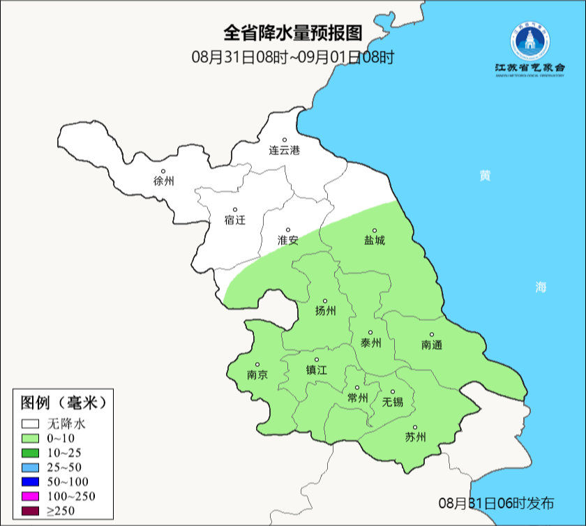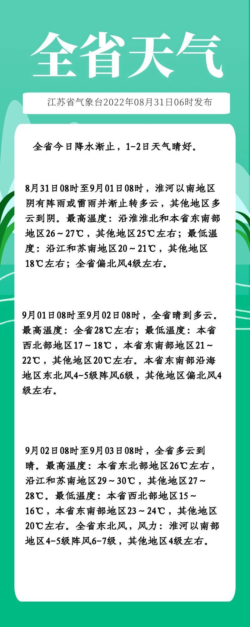 8月31日08时至9月01日08时,淮河以南地区阴有阵雨或雷雨并渐止转多云,其他地区多云到阴。最高温度:沿淮淮北和本省东南部地区26~27℃,其他地区25℃左右;最低温度:沿江和苏南地区20~21℃,其他地区18℃左右;全省偏北风4级左右。