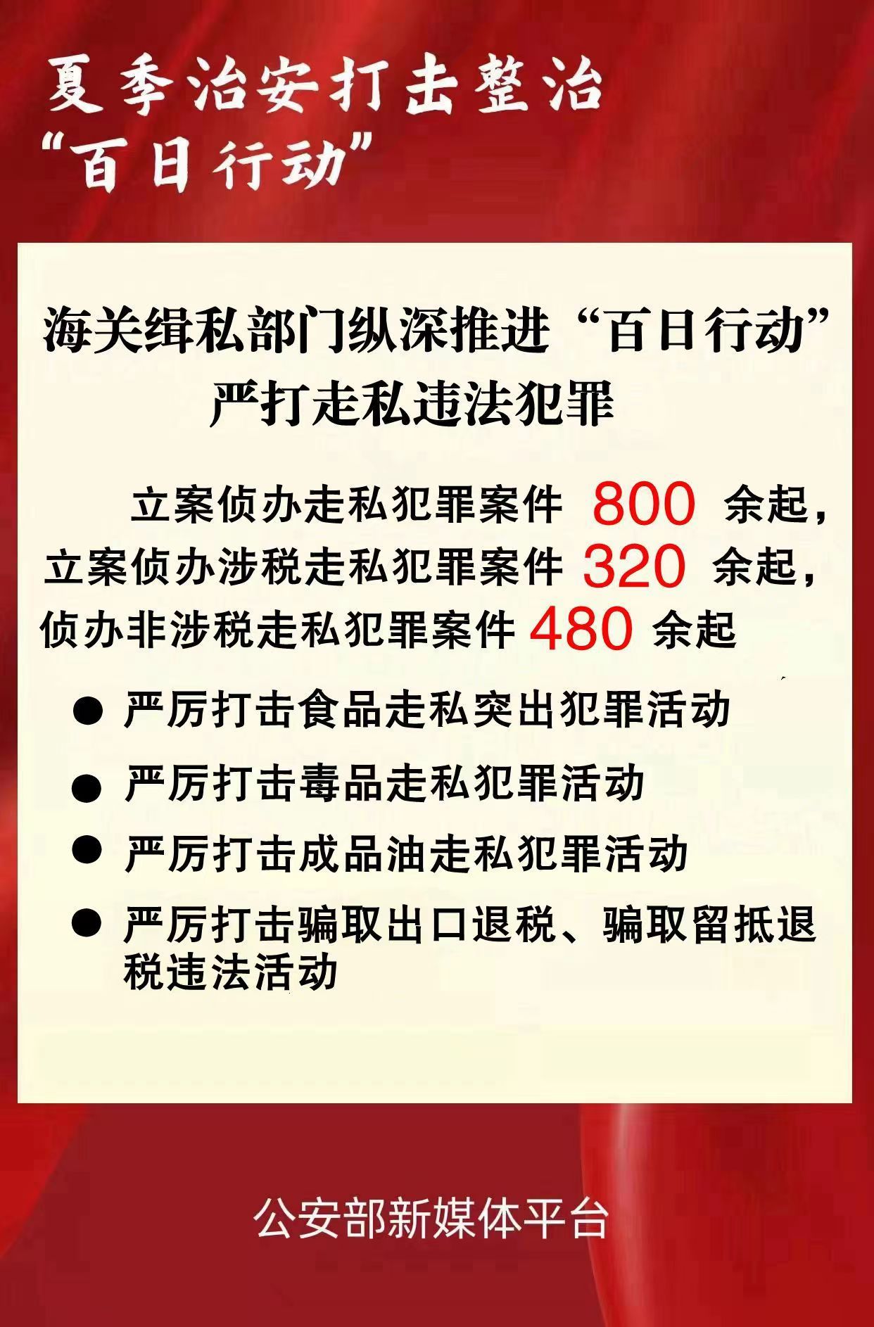 海关总署缉私局负责人表示,全国海关缉私部门将持续纵深推进“百日行动”,始终保持打击走私高压态势,联合协同各警种各部门深挖彻查走私关联犯罪,以实实在在的打私成绩切实维护国家安全和群众利益。