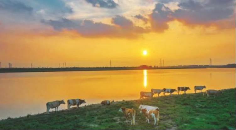 泗洪县百里湖湾生态廊道及溧河洼风景区,位于该县青阳街道和石集乡境内。这里以前是河道大堤,通行不畅,环境有待提升,经过水利部门的建设及生态修复,现在这里新建了防汛道路、骑行道,设置了亲水平台、景观长廊、亭台等,既提高了防洪标准、构筑了亮丽的风景线,也为群众休闲锻炼、生态旅游提供了好去处。傍晚的晚霞映红了天空,牛羊在悠闲地吃着青草,爱好摄影的朋友们,纷纷按下快门记录这一美好瞬间。