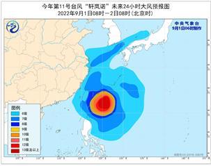 中央气象台9月1日06时继续发布台风预报:今年第11号台风“轩岚诺”(超强台风级)的中心今天(9月1日)早晨5点钟位于台湾省台东市偏东方向约510公里的西北太平洋洋面上,就是北纬23.1度、东经126.1度,中心附近最大风力17级以上(62米/秒),中心最低气压为915百帕,七级风圈半径240~280公里,十级风圈半径120公里,十二级风圈半径60公里。