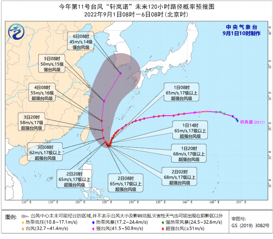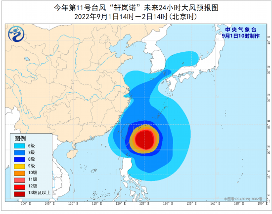今年第11号台风“轩岚诺”(超强台风级)的中心今天(9月1日)上午10点钟位于台湾省台东市偏东方向约470公里的西北太平洋洋面上,就是北纬22.3度、东经125.7度,中心附近最大风力17级以上(65米/秒),中心最低气压为910百帕,七级风圈半径240~280公里,十级风圈半径120公里,十二级风圈半径60公里。