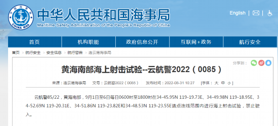 云航警85/22,黄海南部,9月1日至6日每日0600时至1800时在34-45.95N 119-19.73E、34-49.98N 119-18.95E、34-52.69N 119-20.31E、34-51.86N 119-23.82E和34-48.53N 119-23.55E诸点连线范围内进行海上射击试验,禁止驶入。