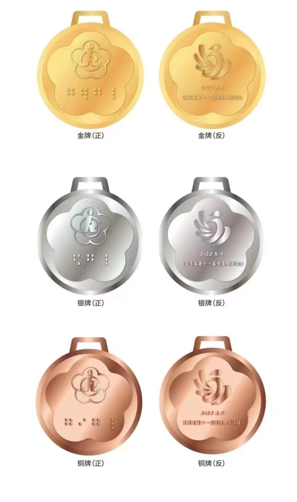 奖牌整体为圆型,寓意全省残疾人大团圆的体育盛会,内嵌梅花造型,既突出泰州市话梅花,又与中国残联的会标相呼应。奖牌正面为中国残联会标,辅以盲文,兼顾各类残疾人的需求。