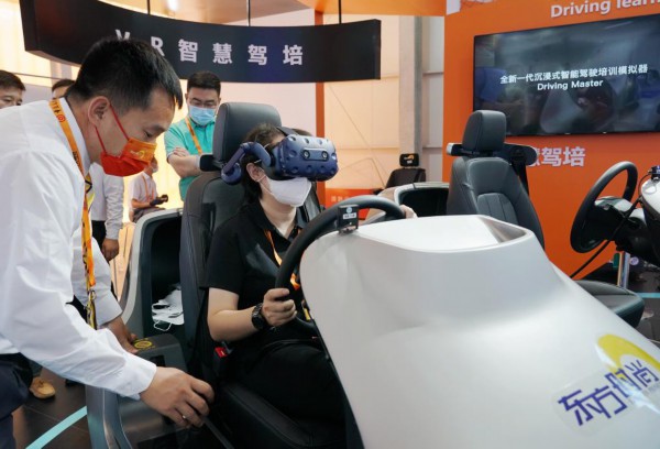 9月1日,参观者在服贸会首钢园区展馆内体验一款VR智慧驾驶培训设备。新华社记者 张晨霖 摄