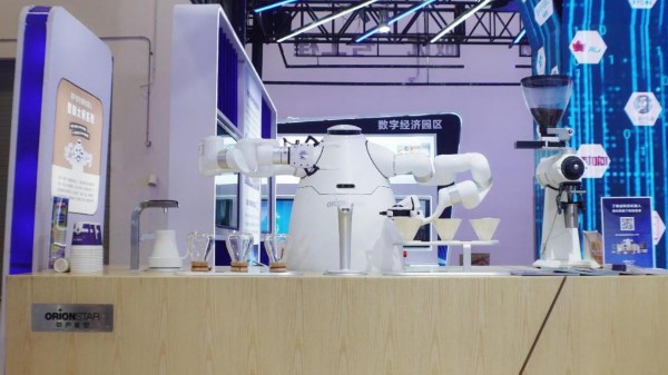 午后,现场飘来的咖啡香引人驻足。一个白色的咖啡机器人灵活熟练地施展着它的仿生双臂,漂亮地完成螺旋倒水等一连串手冲咖啡动作。