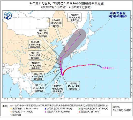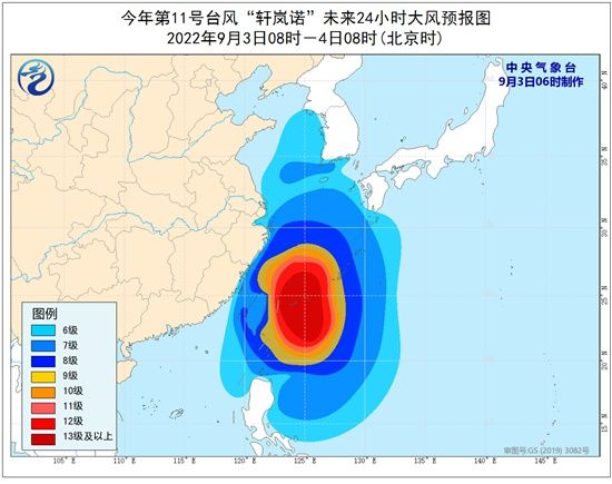 大风预报:9月3日08时至4日08时,巴士海峡、台湾海峡、台湾以东洋面、黄海南部、东海大部及钓鱼岛附近海域、长江口区、杭州湾,以及台湾岛北部和东部沿海、福建中北部沿海、浙江沿海、上海沿海、江苏南部沿海将有6-8级大风,阵风9-10级,其中台湾以东洋面的风力有9-12级,阵风11-15级,“轩岚诺”中心经过的附近海面的风力有13-15级,阵风可达16-17级。
