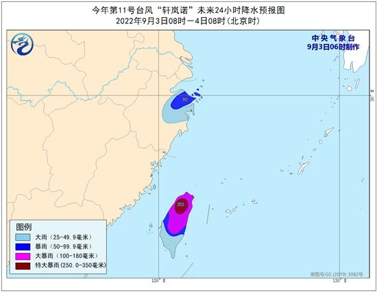 降水预报:9月3日08时至4日08时,浙江东北部、台湾岛等地将有大到暴雨,其中台湾岛北部的部分地区将有大暴雨,局地特大暴雨(250-350毫米)。