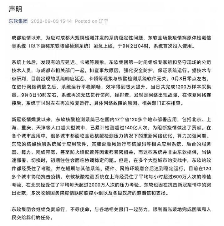 荔枝新闻讯 9月3日下午,东软集团发布声明称,成都疫情以来,为应对成都大规模检测并发的系统稳定性问题,东软全场景疫情病原体检测信息系统(以下简称东软核酸检测系统)紧急上线,于9月2日04时,系统首次投入使用。