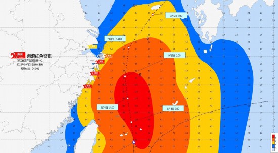 浙江省海洋监测预报中心9月3日16时发布海浪红色警报。受第11号台风“轩岚诺”(强台风级)影响,预计今天夜间到明天白天: