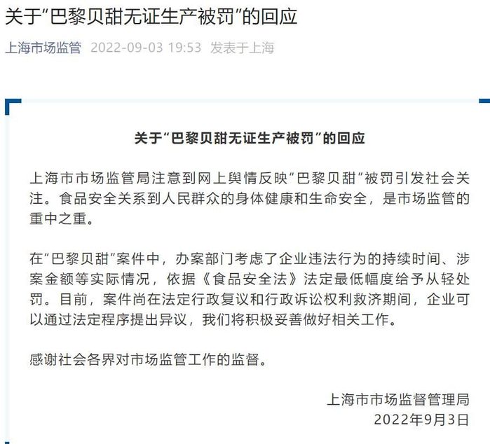 上海市市场监管局注意到网上舆情反映“巴黎贝甜”被罚引发社会关注。食品安全关系到人民群众的身体健康和生命安全,是市场监管的重中之重。