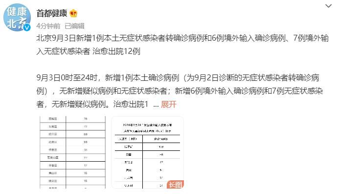 荔枝新闻讯 北京9月3日新增1例本土无症状感染者转确诊病例和6例境外输入确诊病例、7例境外输入无症状感染者 治愈出院12例。