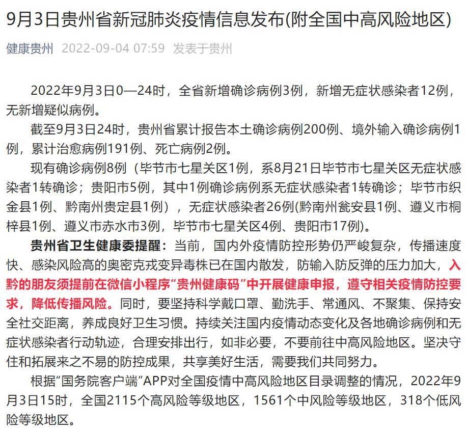 截至9月3日24时,贵州省累计报告本土确诊病例200例、境外输入确诊病例1例,累计治愈病例191例、死亡病例2例。