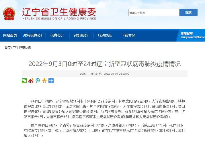 截至9月3日24时,辽宁省累计报告确诊病例1839例(含境外输入273例),治愈出院1770例,死亡2例,在院治疗67例(本土62例、境外输入5例)。目前,尚在医学观察的无症状感染者679例(本土632例、境外输入47例)。