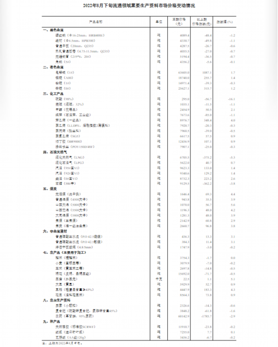 据国家统计局官网消息,9月4日,国家统计局发布了2022年8月下旬流通领域重要生产资料市场价格变动情况。据对全国流通领域9大类50种重要生产资料市场价格的监测显示,2022年8月下旬与8月中旬相比,25种产品价格上涨,24种下降,1种持平。