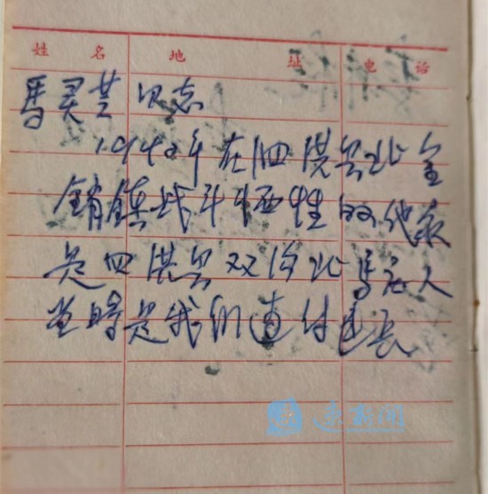 “父亲去世后,我在整理遗物时发现了一本日记,日记中父亲记录了这样一段话:‘马灵芝同志,1942年在泗洪县北金锁镇战斗牺牲的,他是泗洪县双沟北马庄人,当时是我们连付(副)连长。’我想父亲和他的战友之间的感情一定很深,我一定要完成他的遗愿。”花纯征说,看到父亲日记本上对战友的牵挂,回想起父亲不间断的寻找,于是,他想替父亲继续寻找下去。