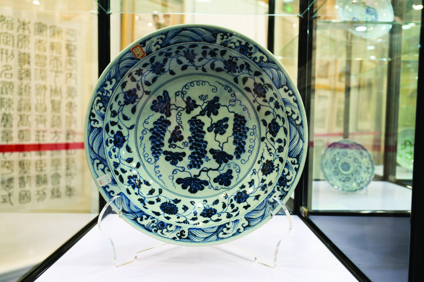 本次精品展吸引了众多市民前来参观,多件精品让大家直呼大饱眼福。“《明永乐·青花缠枝花卉葡萄纹海水折沿大盘》外形为折沿、弧腹、圈足,仿伊斯兰文化风格折沿盘,为永宣时期经典样式。青花苏麻泥青料发色深沉,海水纹、缠枝葡萄纹、折枝花卉纹构图疏朗而饱满,笔触勾画渲染婉转流畅。沙底细腻光滑,极具永宣特色。”上海天物博物馆馆长、景德镇陶瓷大学御窑研究所所长钱伟鹏说。