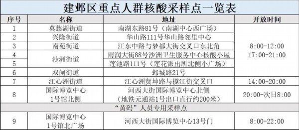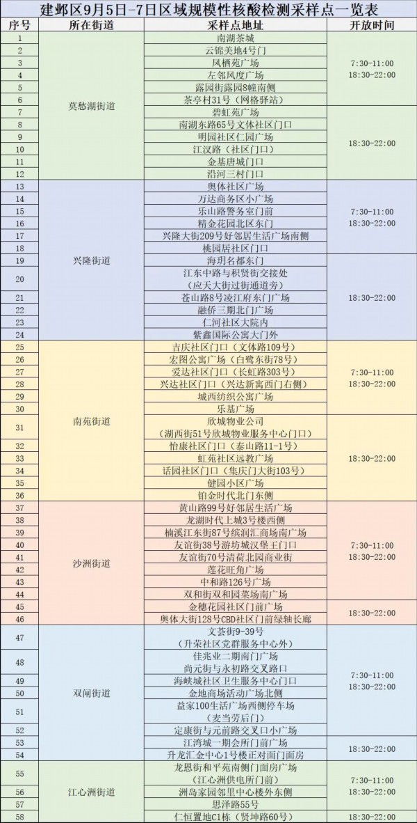 1.建邺区9月5日—7日区域规模性核酸检测采样点一览表