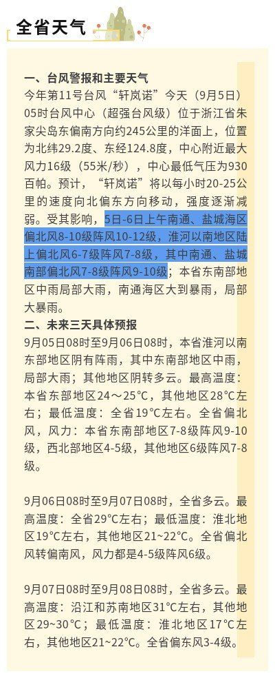 据江苏省气象台,今年第11号台风“轩岚诺”今天(9月5日)05时台风中心(超强台风级)位于浙江省朱家尖岛东偏南方向约245公里的洋面上,位置为北纬29.2度、东经124.8度,中心附近最大风力16级(55米/秒),中心最低气压为930百帕。预计,“轩岚诺”将以每小时20-25公里的速度向北偏东方向移动,强度逐渐减弱。受其影响,5日-6日上午南通、盐城海区偏北风8-10级阵风10-12级,淮河以南地区陆上偏北风6-7级阵风7-8级,其中南通、盐城南部偏北风7-8级阵风9-10级;本省东南部地区中雨局部大雨,南通海区大到暴雨,局部大暴雨。