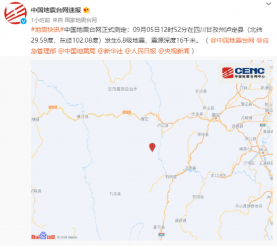 荔枝新闻讯 据泸州发布消息,根据中国地震台网正式测定,9月5日12时52分四川甘孜州泸定县(北纬29.59度,东经102.08度)发生6.8级地震。