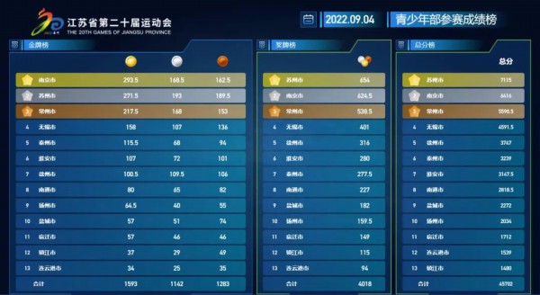 昨天(9月4日)是本届省运会的最后一个比赛日,常州代表团累计获得217.5块金牌、538.5块奖牌、总分5590.5分,以金牌榜、奖牌榜、积分榜均位列全省前三、稳居第一方阵的优秀成绩结束了本届省运会的征程。