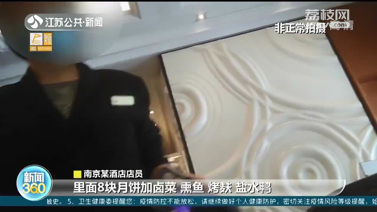 南京某酒店店员介绍,里面有8块月饼加卤菜,熏鱼、烤麸、盐水鸭,一起318元一盒;另一款398元里面是狮子头和牛排。店员表示,如果不要卤菜,他们也有一款纯月饼的礼盒,只要199元。