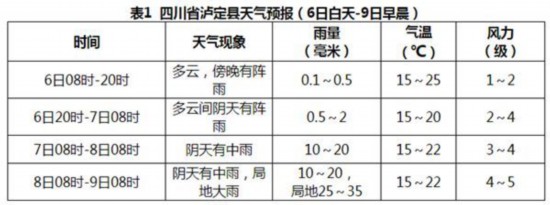 据中央气象台消息,9月5日,四川甘孜州泸定县和雅安市石棉县出现小雨。6日8时,泸定县气温15℃,石棉县17℃。预计,6日泸定县和石棉县阴天间多云有阵雨;7日至8日有明显降雨过程,雨量以中雨为主,局地大雨,具体预报见附表。
