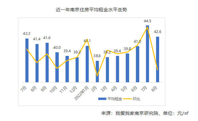 该报告指出,8月份南京住房租赁市场延续了7月的旺季节奏,成交量保持高位运行,环比7月仅下降3%,跟去年8月因疫情导致的非常规市场相比,上涨态势明显。在租金方面,8月南京的平均租金为42.6元/㎡,环比7月下降4.3%,同比去年则略涨2.9%。