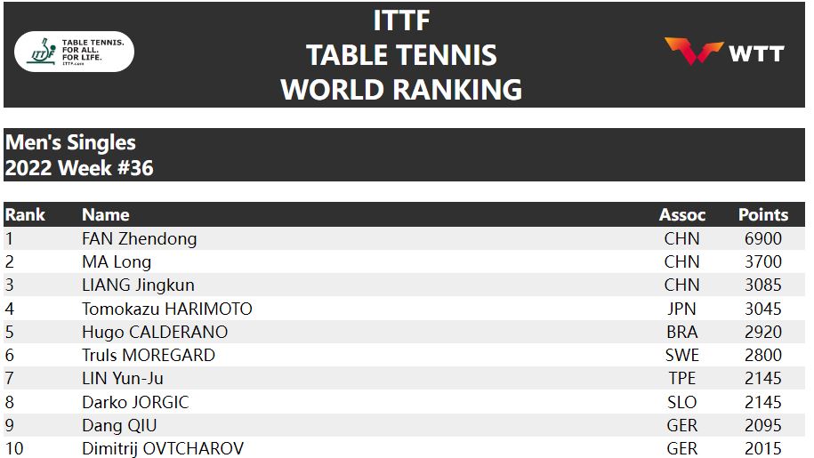 男单樊振东继续以6900分排名位居榜首,马龙和梁靖崑分别以3700分和3085分列在第二和第三。张本智和3045分排名第四,巴西的卡尔德拉诺-雨果第五,瑞典的莫雷加德位列第六,中国台北的林昀儒位居第七,斯洛文尼亚的约吉奇第八。欧锦赛冠军德国选手邱党第九,奥恰洛夫列在第十。王楚钦和林高远分列第11和第12,周启豪上周在WTT支线赛夺冠后,飙升11位排在第39。