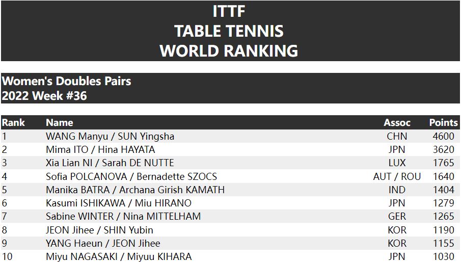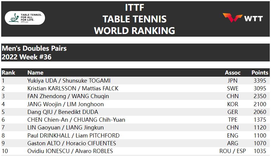 女双王曼昱/孙颖莎以4600分稳居榜首,日本组合伊藤美诚/早田希娜和卢森堡组合倪夏莲/德努特分列第二和第三。男双日本组合戸上隼辅/宇田幸矢以3395分位列首位,瑞典组合卡尔森/法尔克第二,樊振东/王楚钦2350分排在第三。