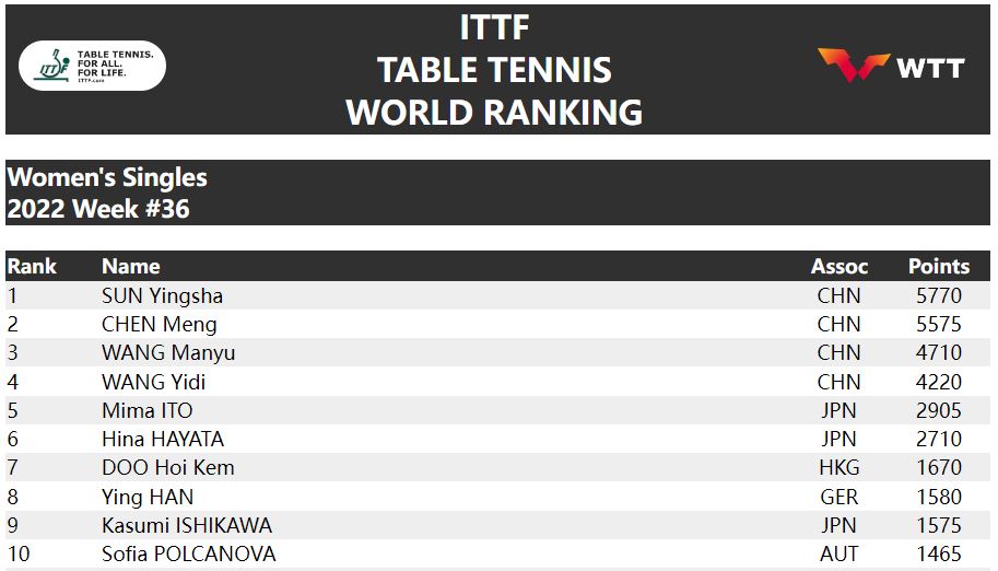 女单孙颖莎以5770分领跑,陈梦5575分紧随其后,王曼昱4710分排在第三,王艺迪4220分位列第四。日本的伊藤美诚和早田希娜分列第五和第六,中国香港的杜凯琹第七,德国华裔名将韩莹第八,石川佳纯第九,奥地利的波尔卡诺娃第十。陈幸同上周获得WTT赛冠军后,提升13到第20,范思琦和张瑞列在第21和第22,卢森堡老将倪夏莲第24,蒯曼排在第29。