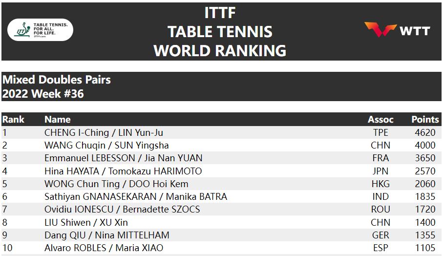 混双方面,中国台北组合郑怡静/林昀儒以4620分排名第一,世乒赛冠军王楚钦/孙颖莎以4000分位列次席,法国组合莱贝松/袁嘉楠位居第三,早田希娜/张本智和列在第四。