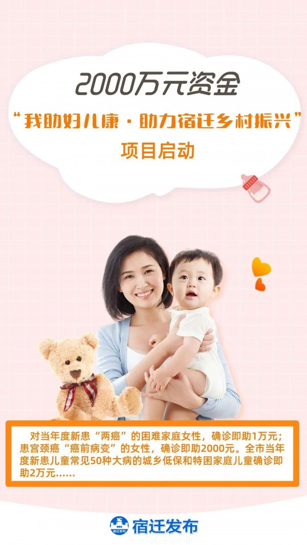 9月5日,小编从宿迁市“政在公开”线上新闻发布会获悉,2022年度“我助妇儿康·助力宿迁乡村振兴”项目将在宿迁实施,项目资金共2000万元。
