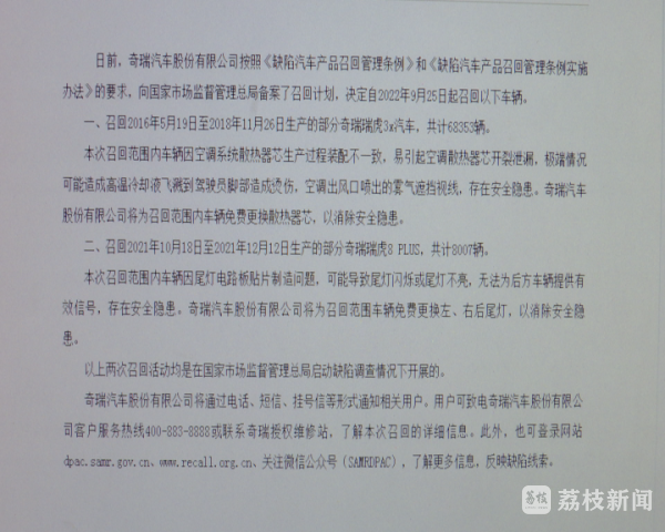 日前,奇瑞汽车股份有限公司向国家市场监督管理总局备案了召回计划,自2022年9月25日起召回2016年5月19日至2018年11月26日生产的部分奇瑞瑞虎3x汽车,共计68353辆,2021年10月18日至2021年12月12日生产的部分奇瑞瑞虎8PLUS,共计8007辆。