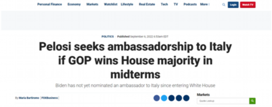 福克斯:如果共和党在中期选举中赢得众议院多数席位,佩洛西将寻求出任美国驻意大利大使
