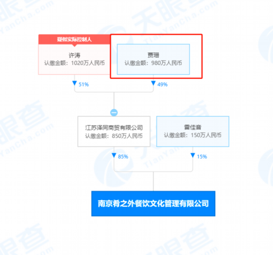 据天眼查,股权穿透图显示,该公司由雷佳音和江苏泽同商贸有限公司分别持股15%、85%,后者则由贾乃亮姐姐贾珊持股49%。