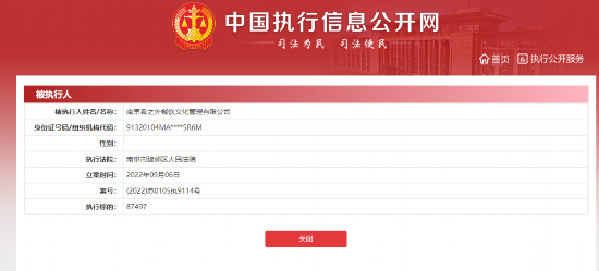 中国网财经9月7日讯 (记者 钟文鑫)据中国执行信息公开网消息,近日,南京肴之外餐饮文化管理有限公司新增被执行人信息,执行标的87497元,执行法院为江苏省南京市建邺区人民法院。
