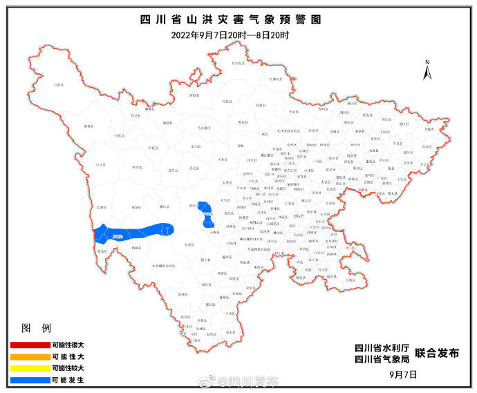 荔枝新闻讯 据四川发布消息,9月7日下午17时,四川省水利厅、四川省气象局联合发布山洪灾害蓝色预警。9月7日20时至8日20时,康定、泸定、巴塘、得荣、乡城、稻城、理塘、雅江、石棉等县(市)可能发生山洪灾害。
