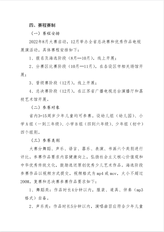 大赛分舞蹈、声乐、语言、器乐、表演、书画六个类别进行评比。参赛作品要求内容健康向上,弘扬社会主义核心价值观和中华优秀传统文化,鼓励选送原创优秀少儿艺术作品。海选阶段参赛作品以视频方式提交,视频格式为mp4或mov,大小不超过200M。