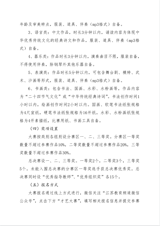 中文作品,时长3分钟以内,诵读内容为体现中华优秀传统文化的经典诗文和作品,服装、道具、伴奏(mp3格式)自备。