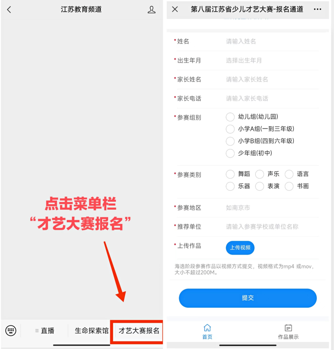 Step 2 :点击下方菜单栏“才艺大赛报名”,填写相关报名信息并提交参赛视频即可