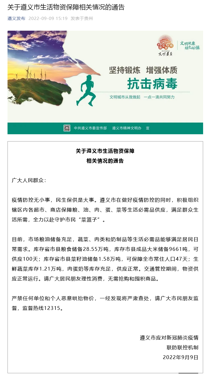 荔枝新闻讯 据遵义发布微信公众号消息,疫情防控无小事,民生保供是大事。遵义市在做好疫情防控的同时,积极组织辖区内各超市、商店保障粮、油、肉、蛋、菜等生活必需品供应,满足群众生活所需,全力以赴守护市民“菜篮子”。
