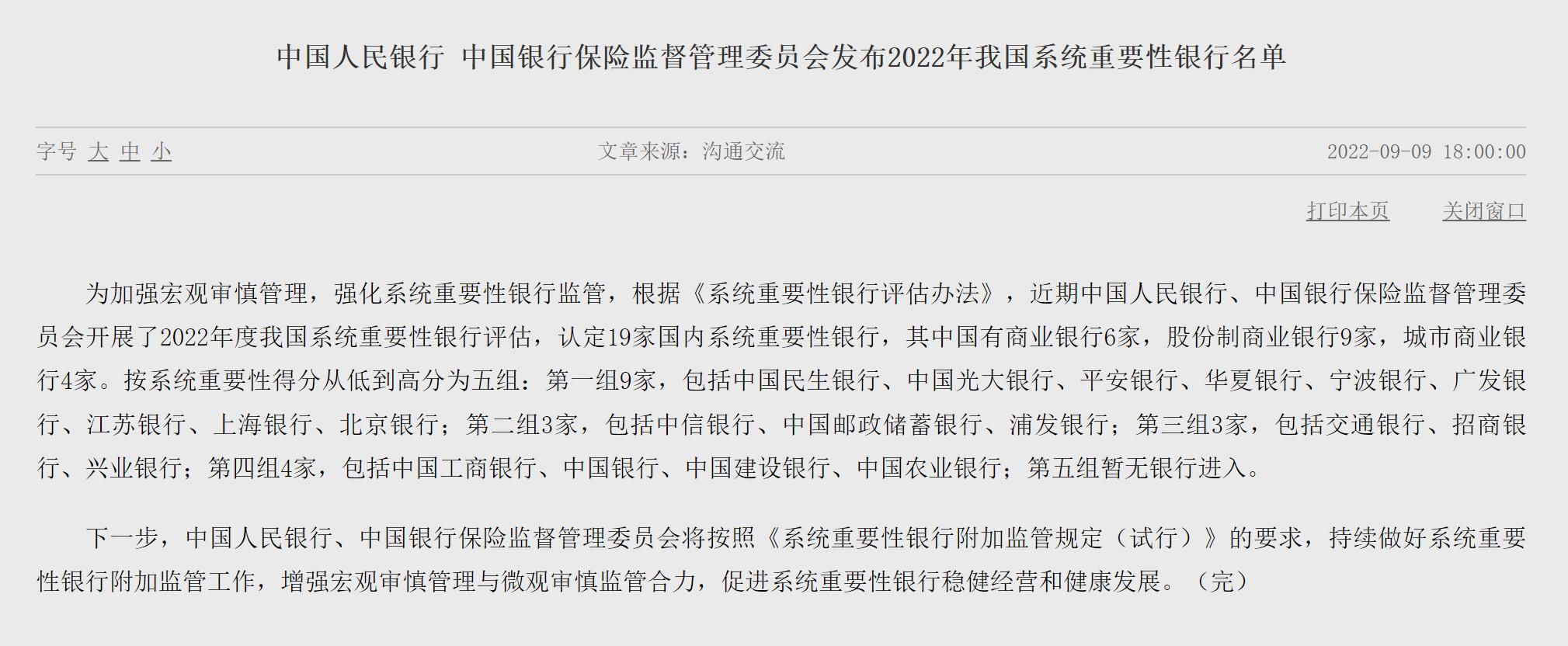为加强宏观审慎管理,强化系统重要性银行监管,根据《系统重要性银行评估办法》,近期中国人民银行、中国银行保险监督管理委员会开展了2022年度我国系统重要性银行评估,认定19家国内系统重要性银行,其中国有商业银行6家,股份制商业银行9家,城市商业银行4家。按系统重要性得分从低到高分为五组: