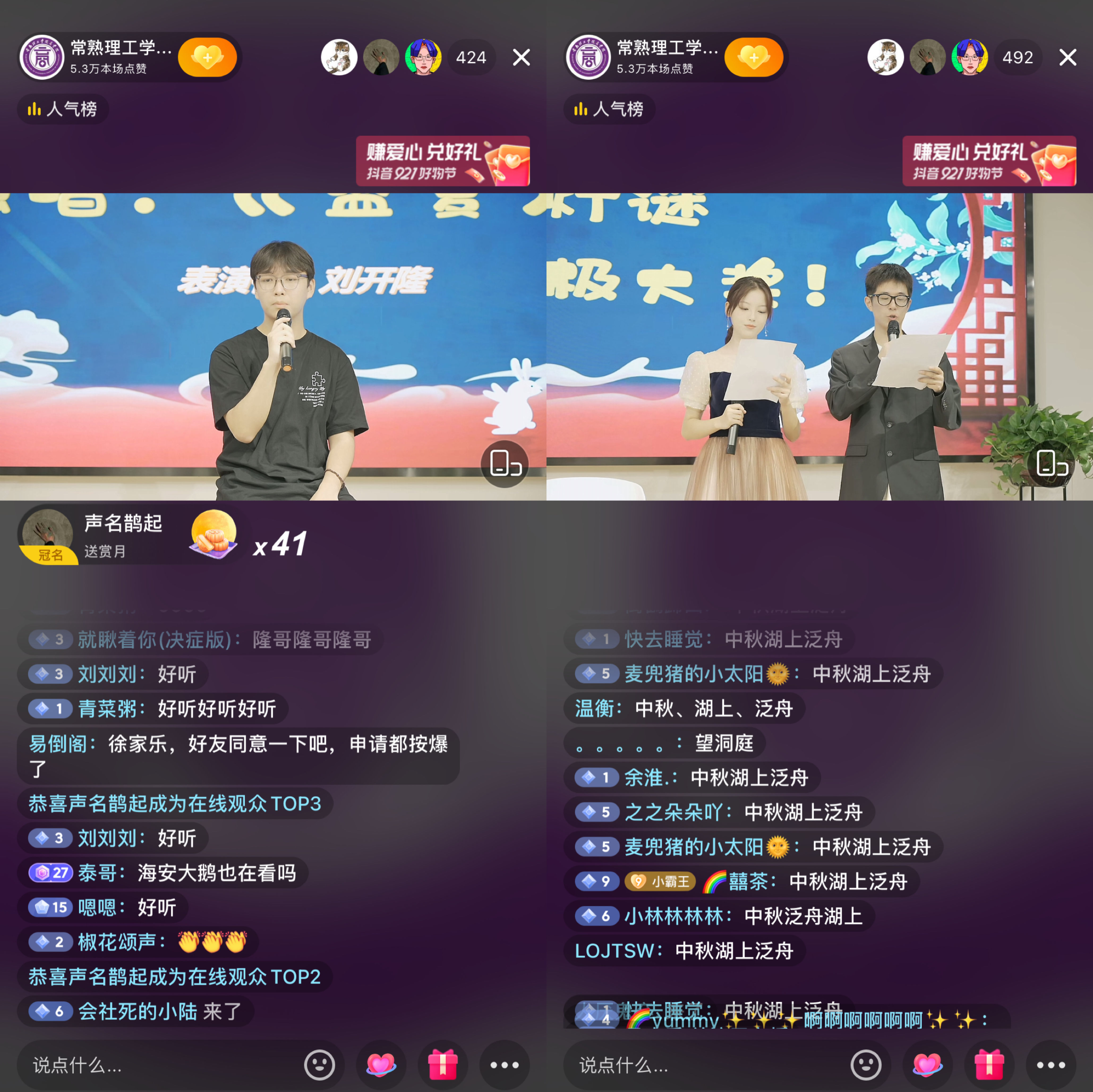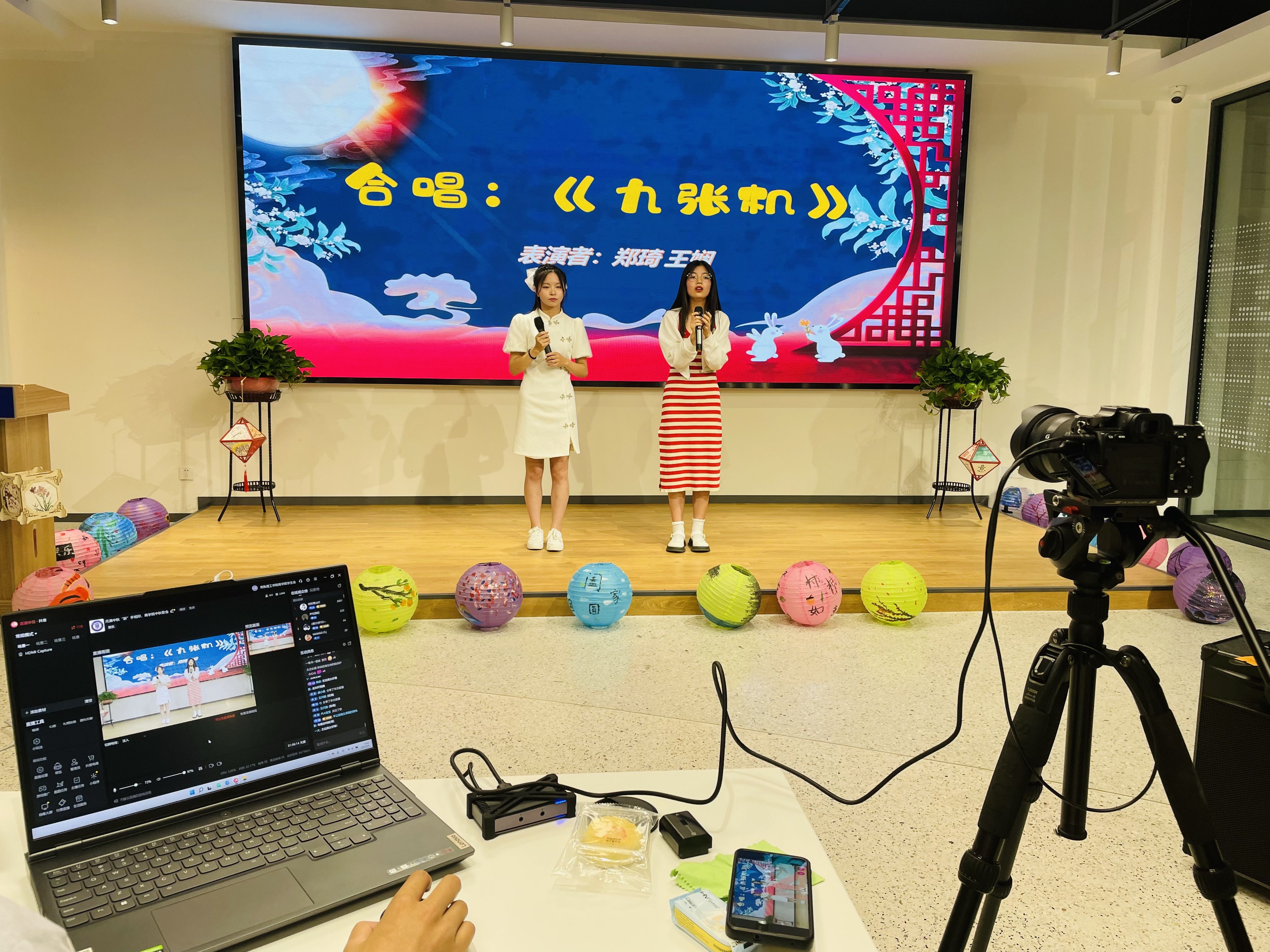 以歌相会唱团圆。“月儿圆哟,你乖乖呀抱阿婆……”悠扬的歌声从礼行楼传出,把思绪拉向儿时的美好回忆。结合新媒体发展特色,商学院“月满中秋”主题歌会在直播平台上温馨开播,古筝奏乐《兰亭序》、朗诵《团圆》《月光》、钢琴演奏《平湖秋月》、深情对唱、优雅独唱…商学院师生共聚云端,用歌声传递思念与祝福。线下舞台精心展演,线上观众互动热烈,全程直播一个半小时,累计观众7700余人次,点赞5万4千余次。