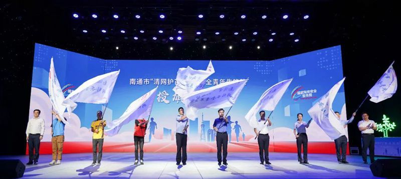 陈威涛、杨江华为来自公安系统、社区网格、志愿服务、行政执法、教师、金融、电信网络以及快递外卖8个行业领域的南通市“清网护苗”网络安全青年先锋队授旗,希望他们用热血担当继续为青少年网络安全护航开路。