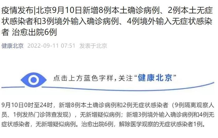 荔枝新闻讯 9月10日0时至24时,北京新增8例本土确诊病例和2例无症状感染者(9例隔离观察人员、1例发热门诊筛查发现),无新增疑似病例;新增3例境外输入确诊病例和4例无症状感染者,无新增疑似病例。治愈出院6例,解除医学观察的无症状感染者1例。