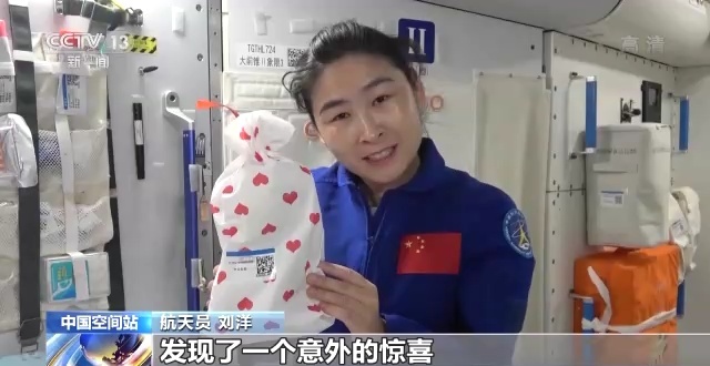 航天员 刘洋:我在我们的食品包里面发现了一个意外的惊喜,地面的工作人员细心地为我们准备了节日礼包。除此之外,我们还收到了中国航天员训练中心全体科研人员的一封饱含深情的慰问信。特别感谢地面保障人员,让我们的太空生活也充满了浪漫和惊喜,也祝大家节日快乐。