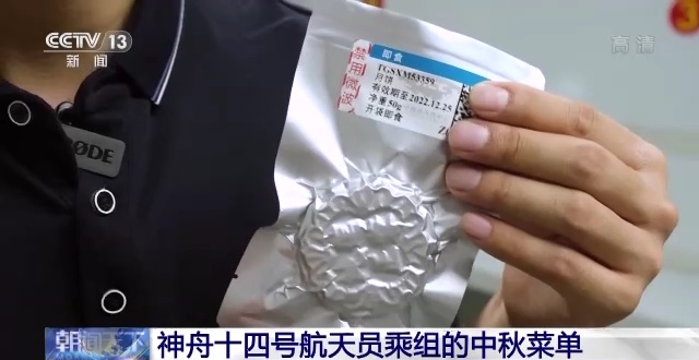总台央视记者 刘冠青:这就是神舟十四号航天员乘组这次中秋节要吃的月饼,这个月饼大家可以看到它是全铝箔的包装,上面还标注了二维码和生产日期,在太空当中,航天员打开包装就可以直接食用了。