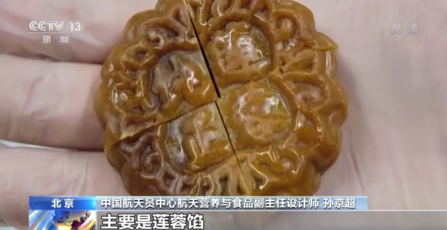 中国航天员中心航天营养与食品副主任设计师 孙京超:大家肯定也比较好奇究竟是什么馅,其实我们这边月饼主要是莲蓉馅,更有利于被他们接受。