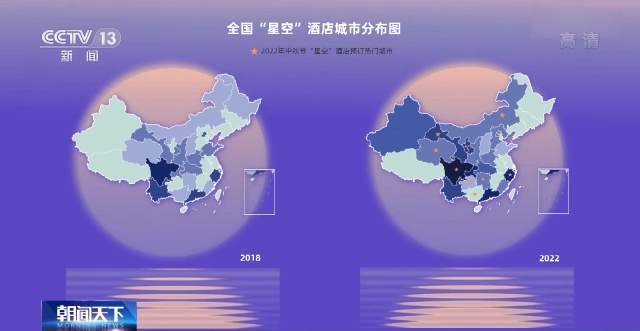 综合出行平台数据,我们绘出了一份全国星空主题民宿分布图,颜色越深,代表该省份的星空民宿越多。从2018年到现在,颜色加深的区域在不断扩大,东中西部的星空民宿也在不断增加,北京、黔西南、中卫、呼伦贝尔、娄底等城市成为星空民宿入驻热门目的地。
